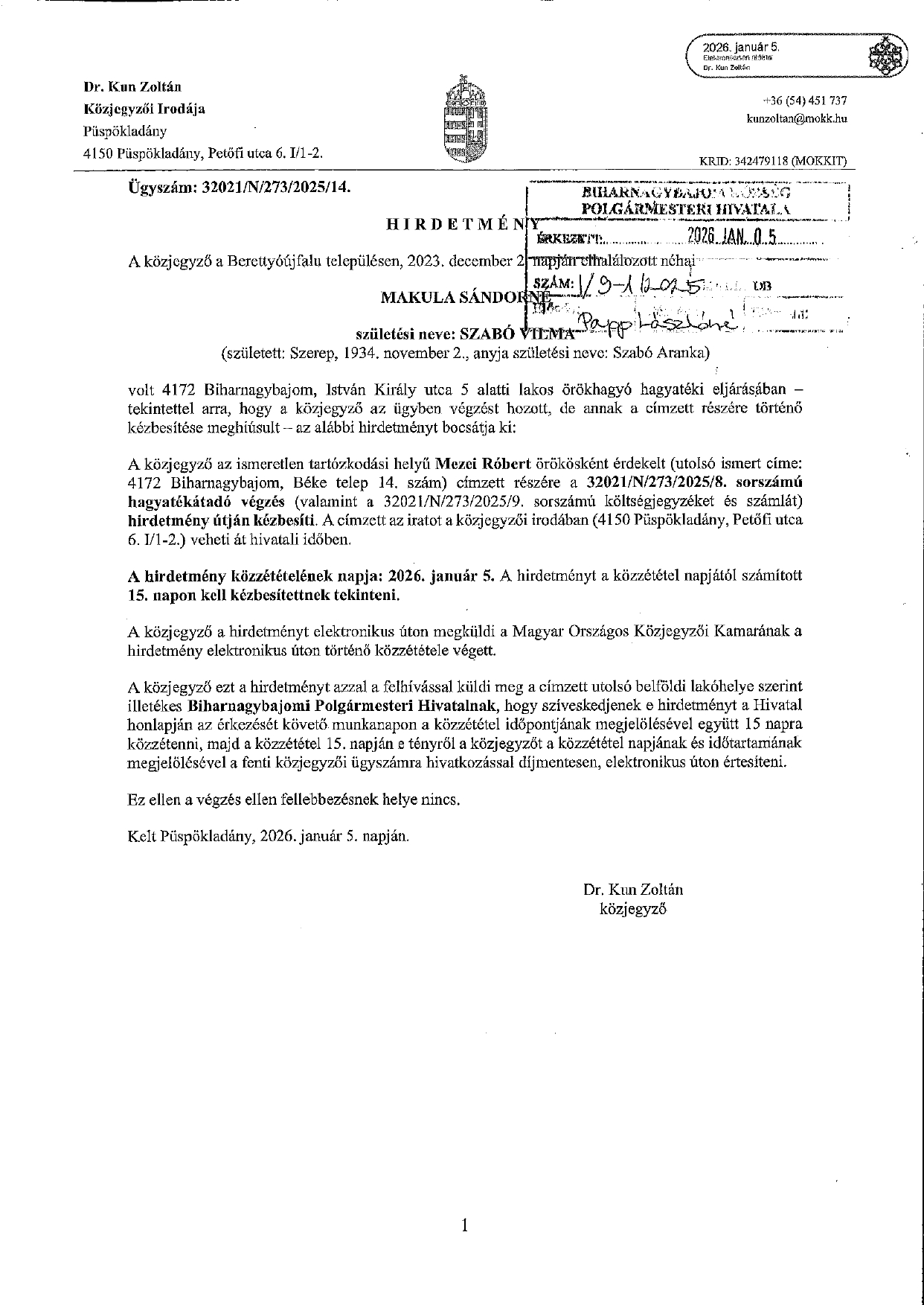 Híreink Közjegyzői hirdetmény Szitó Sándor 2026. január 07. Kapcsolódó tartalom Nincs kapcsolódó tartalom Continue Reading Previous: PÁLYÁZATI FELHÍVÁS Hasonló cikkek PÁLYÁZATI FELHÍVÁS Híreink PÁLYÁZATI FELHÍVÁS 2025. december 01. Álláshirdetés Híreink Álláshirdetés 2025. november 26. Hírdetmény Híreink Hírdetmény 2025. november 17.